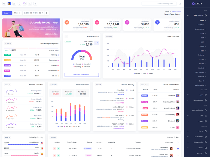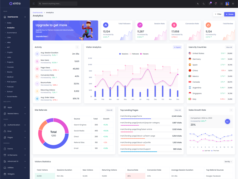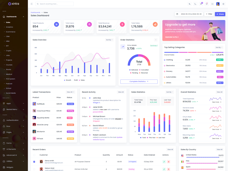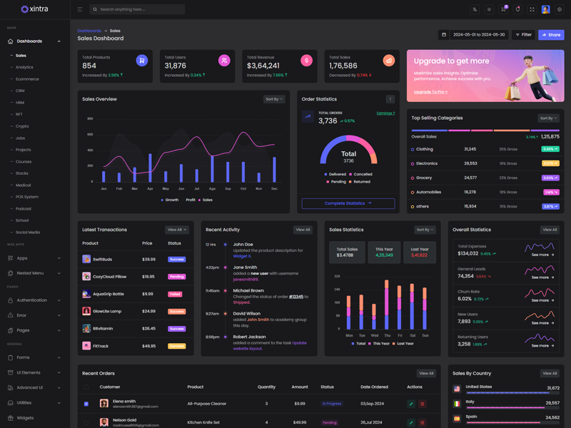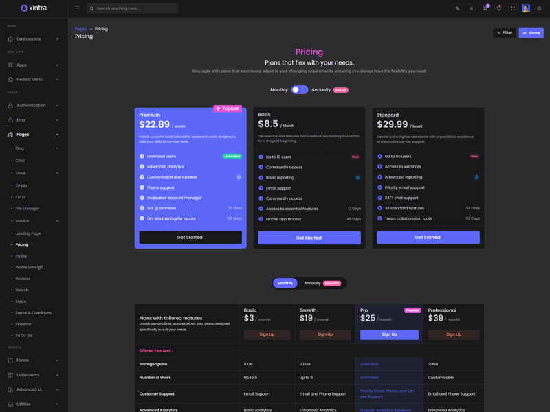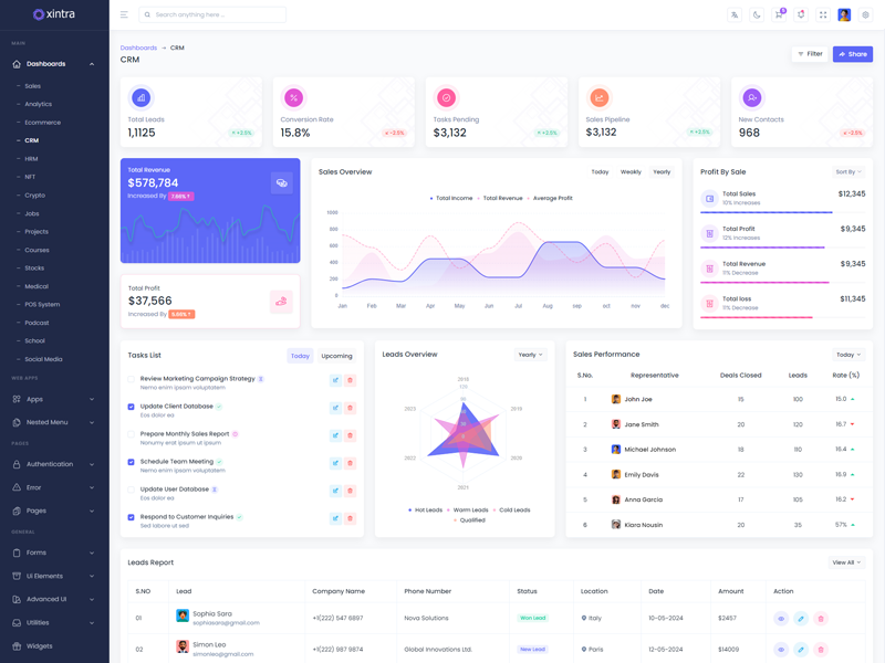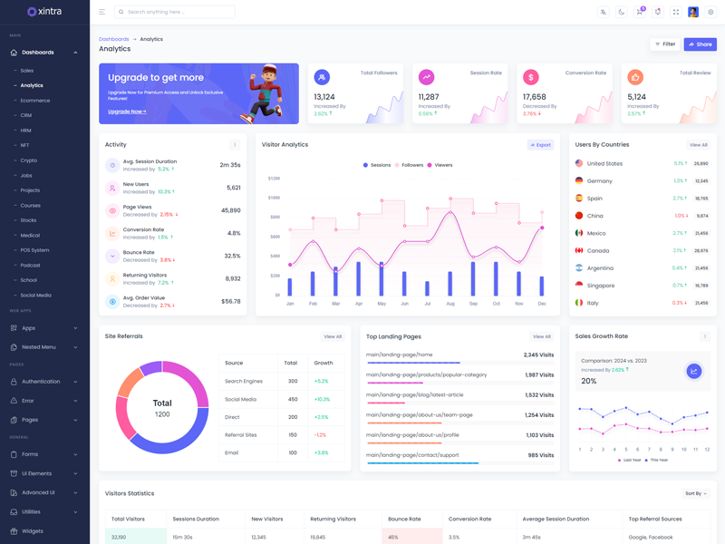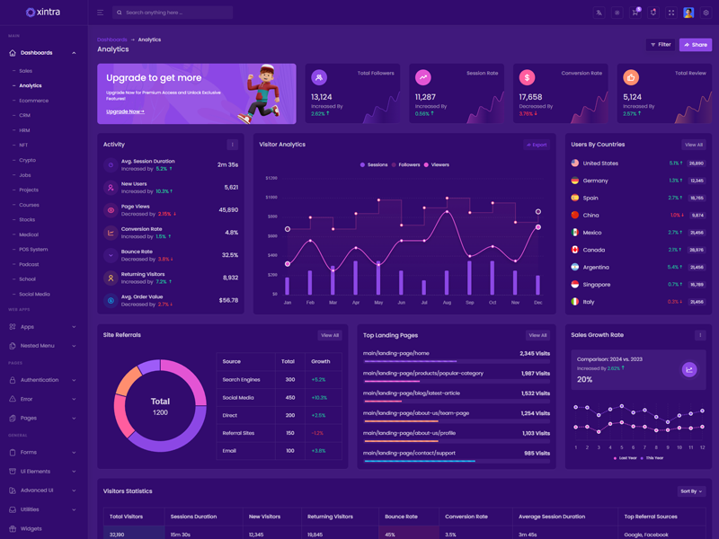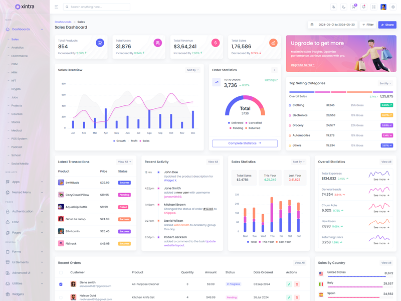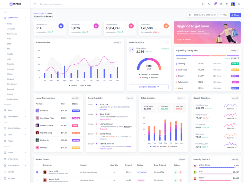 Xintra - Premium Tailwind CSS Admin & Dashboard Template boasts essential features such as design quality, compatibility with your front-end framework, responsiveness, ease of customization, comprehensive documentation, and dedicated support. Additionally, it includes integrated plugins and other supplementary features.